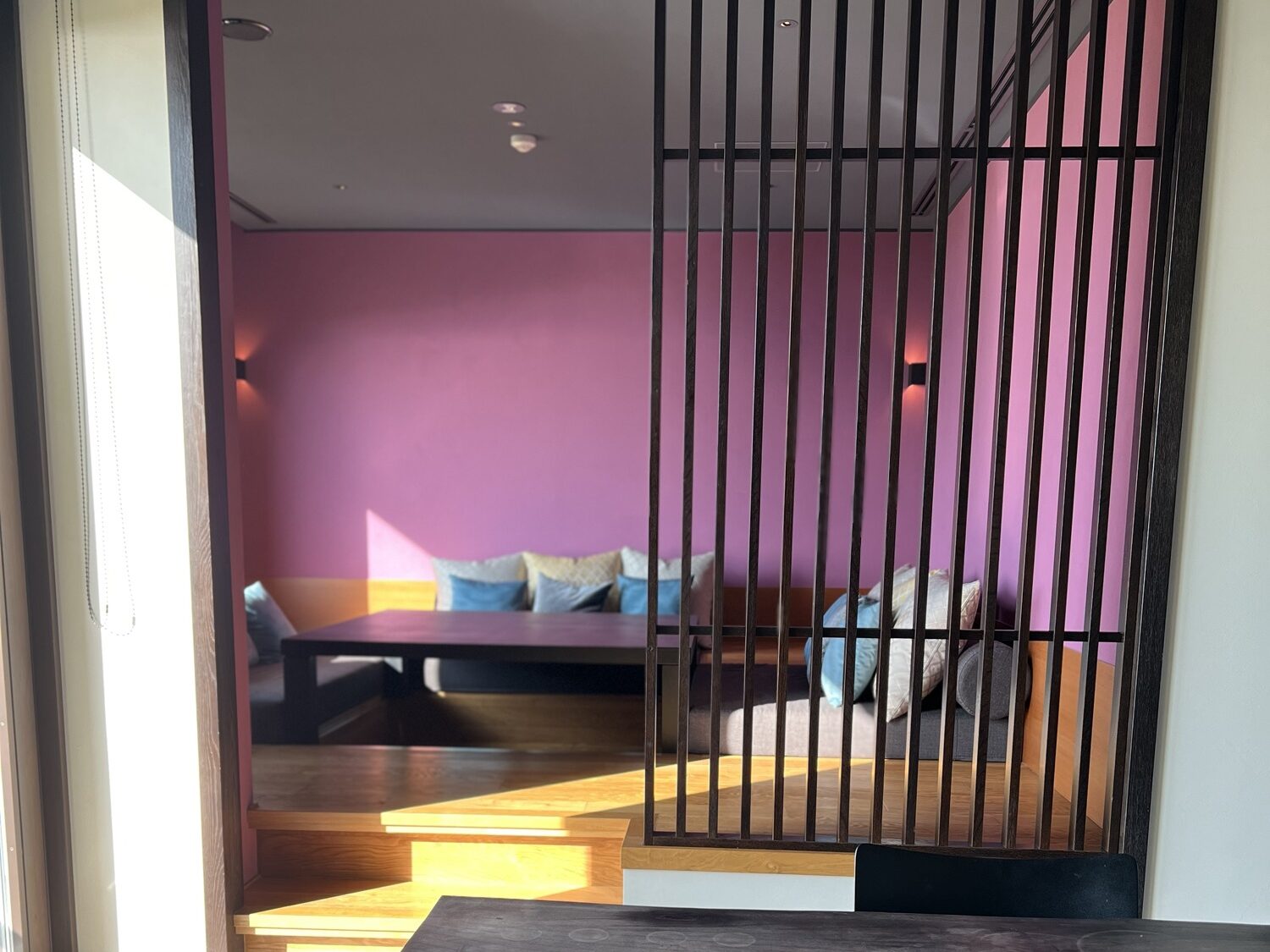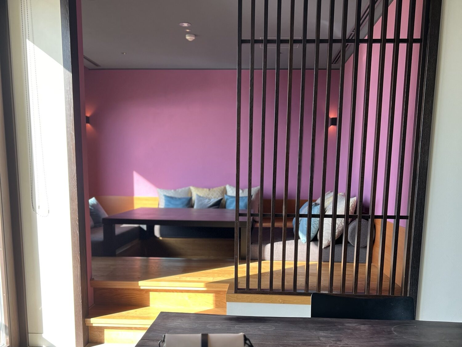 部屋はどこでもよさそうな感じもしましたが、私はこの座床リビングのピンクの壁がかわいいな~って思ったし