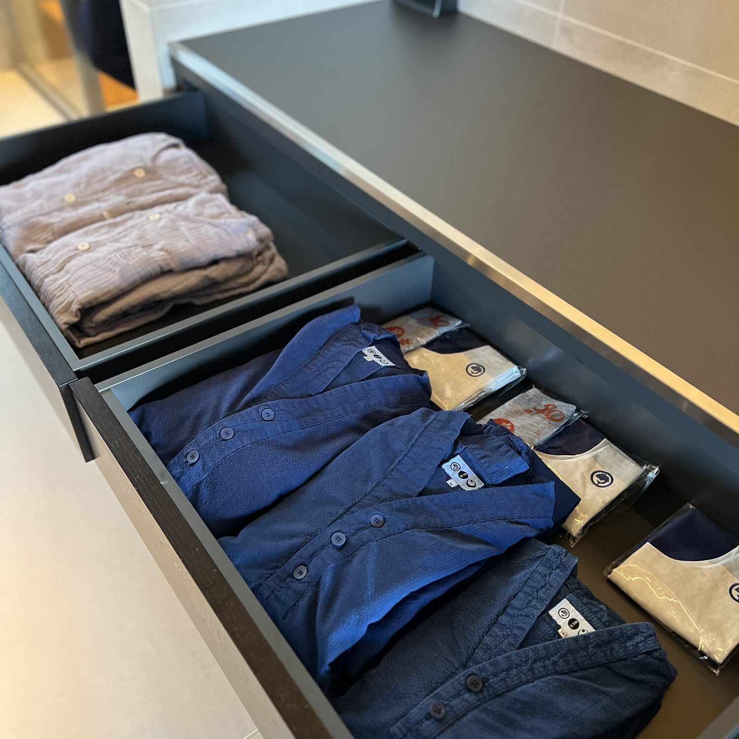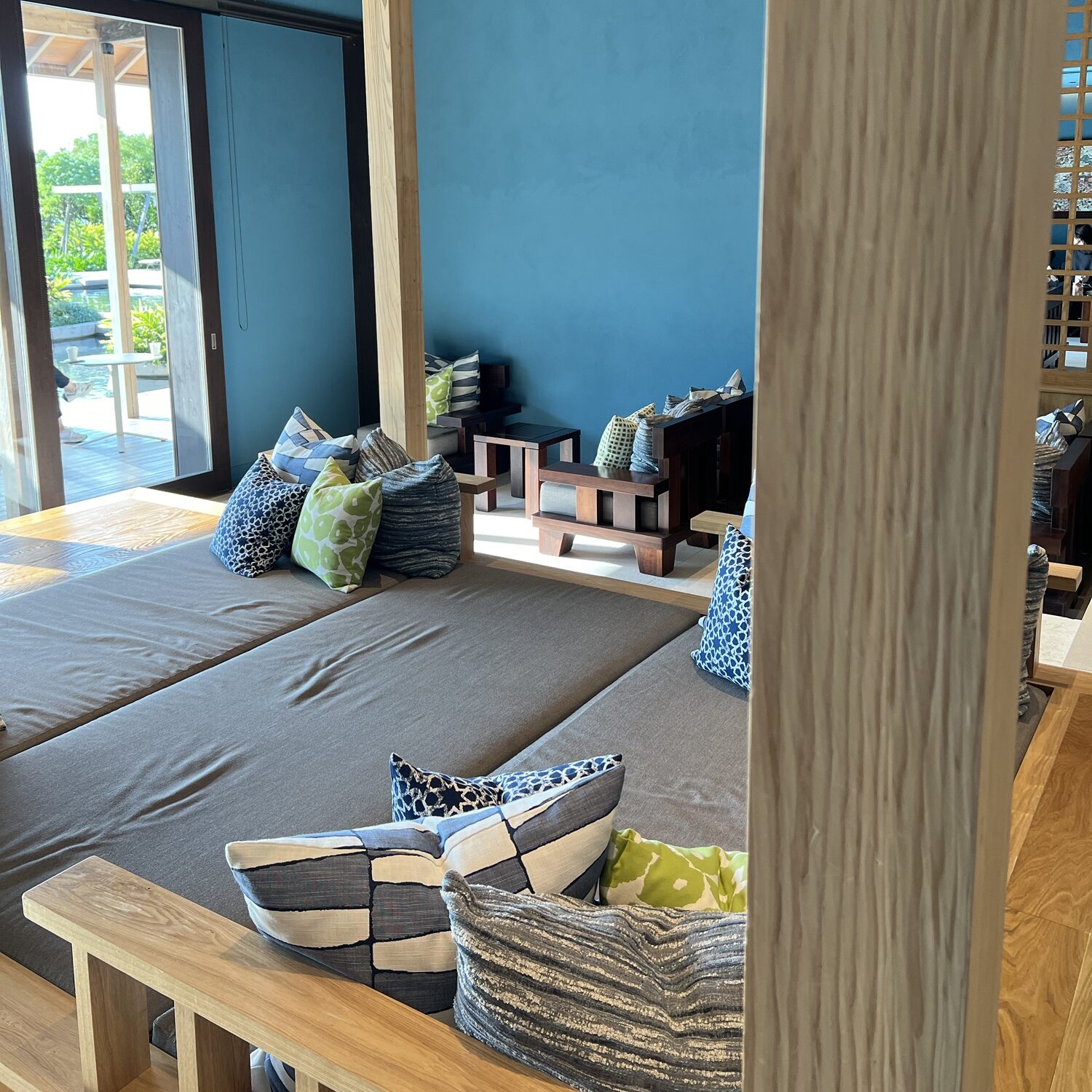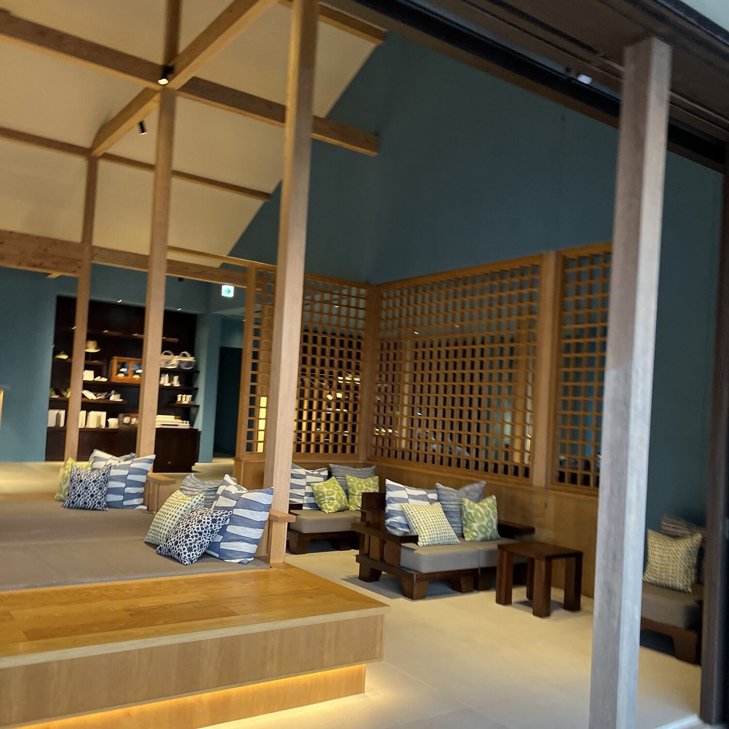 中に入ると木目と青色の部屋が目に飛び込んできます