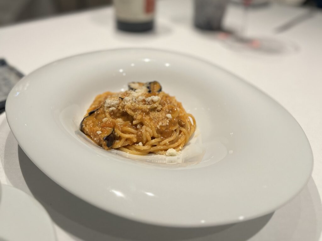 カボチャのスープにサラダなどの前菜が最初に運ばれ、続いてナスとひき肉のパスタ