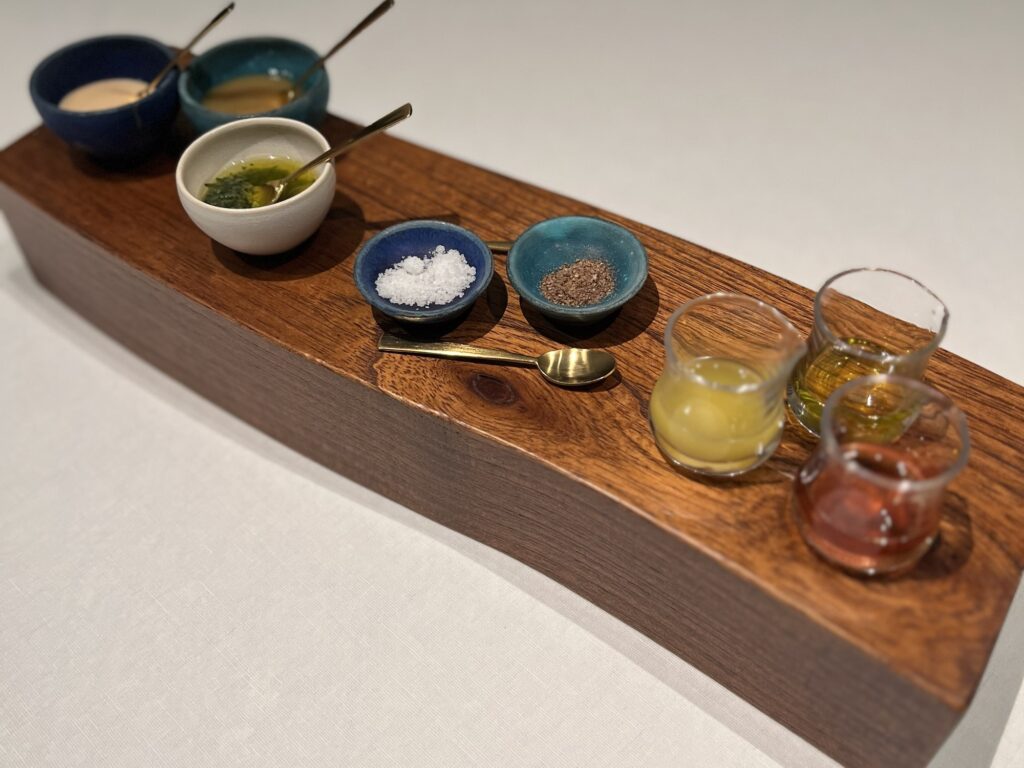 稚魚を塩漬けする「スクガラス」や中国から渡った紅腐乳が独自に発展した「豆腐よう」など、沖縄特有の発酵食品をアレンジした「発酵コンディメント」が添えられていろいろな味変を楽しみながらいただきます