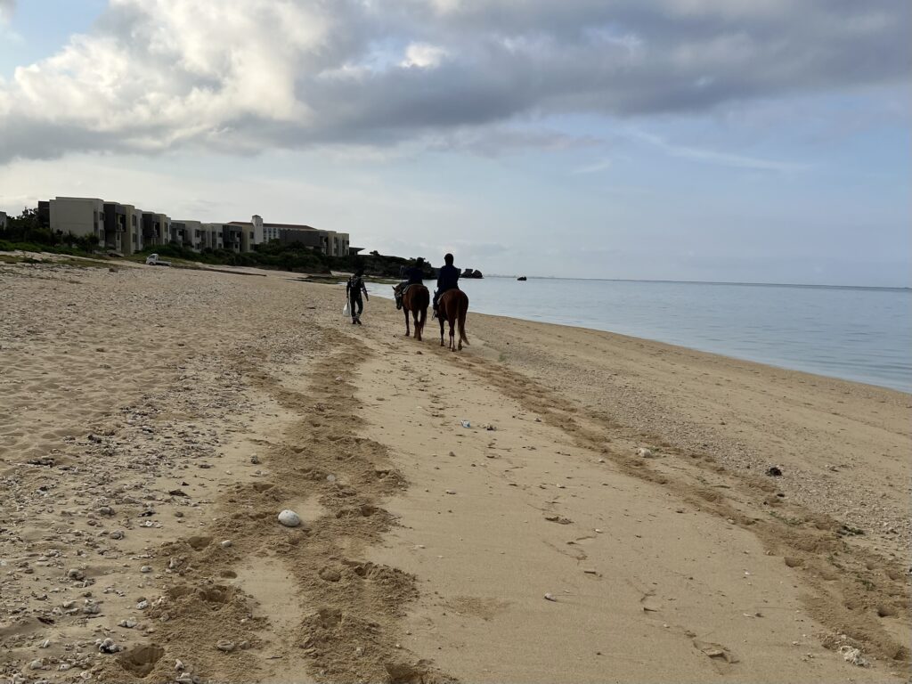 ホテルの前の浜辺を海を見ながら乗馬します