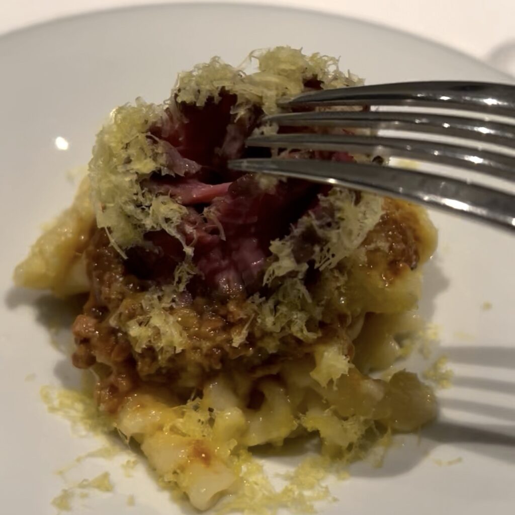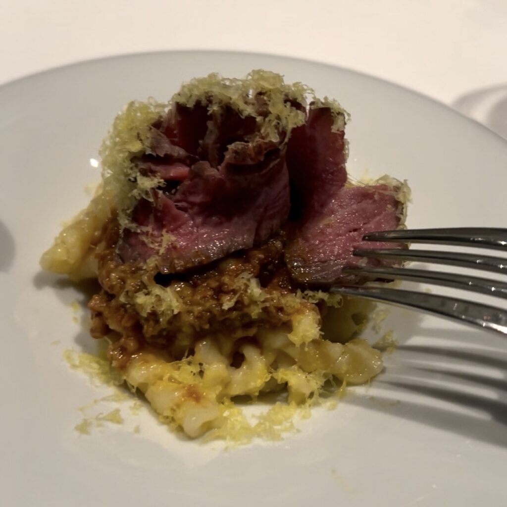 ラグーパスタの上にジューシーなローストビーフが盛りつけられています