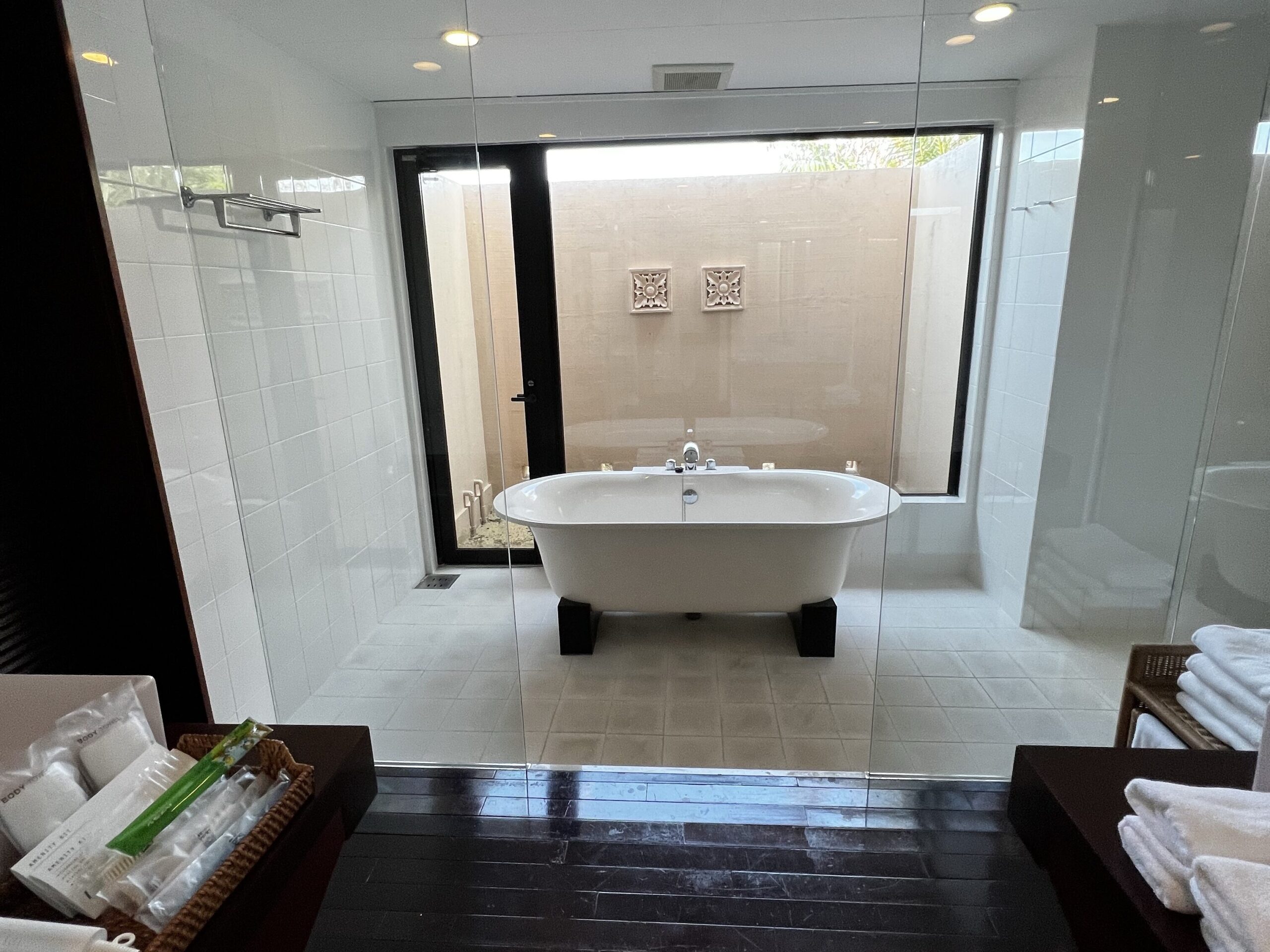 遊んだ後に開放的なバスルームやデイベッドがある部屋があるリゾナーレ小浜島は
