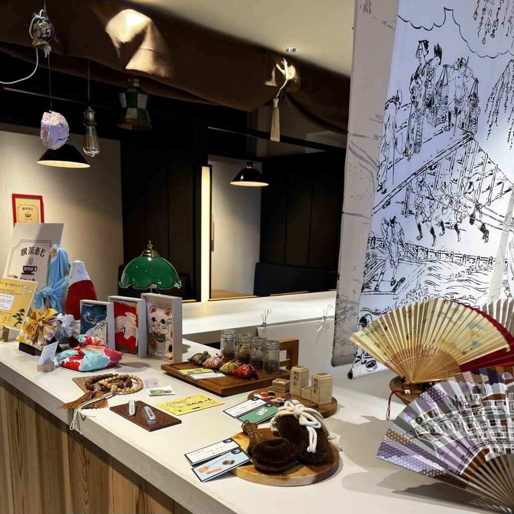 高瀬舟が活躍していた時代の絵を目の前に現在の工芸品を見たりしながら休憩ができるテーブルとなっています