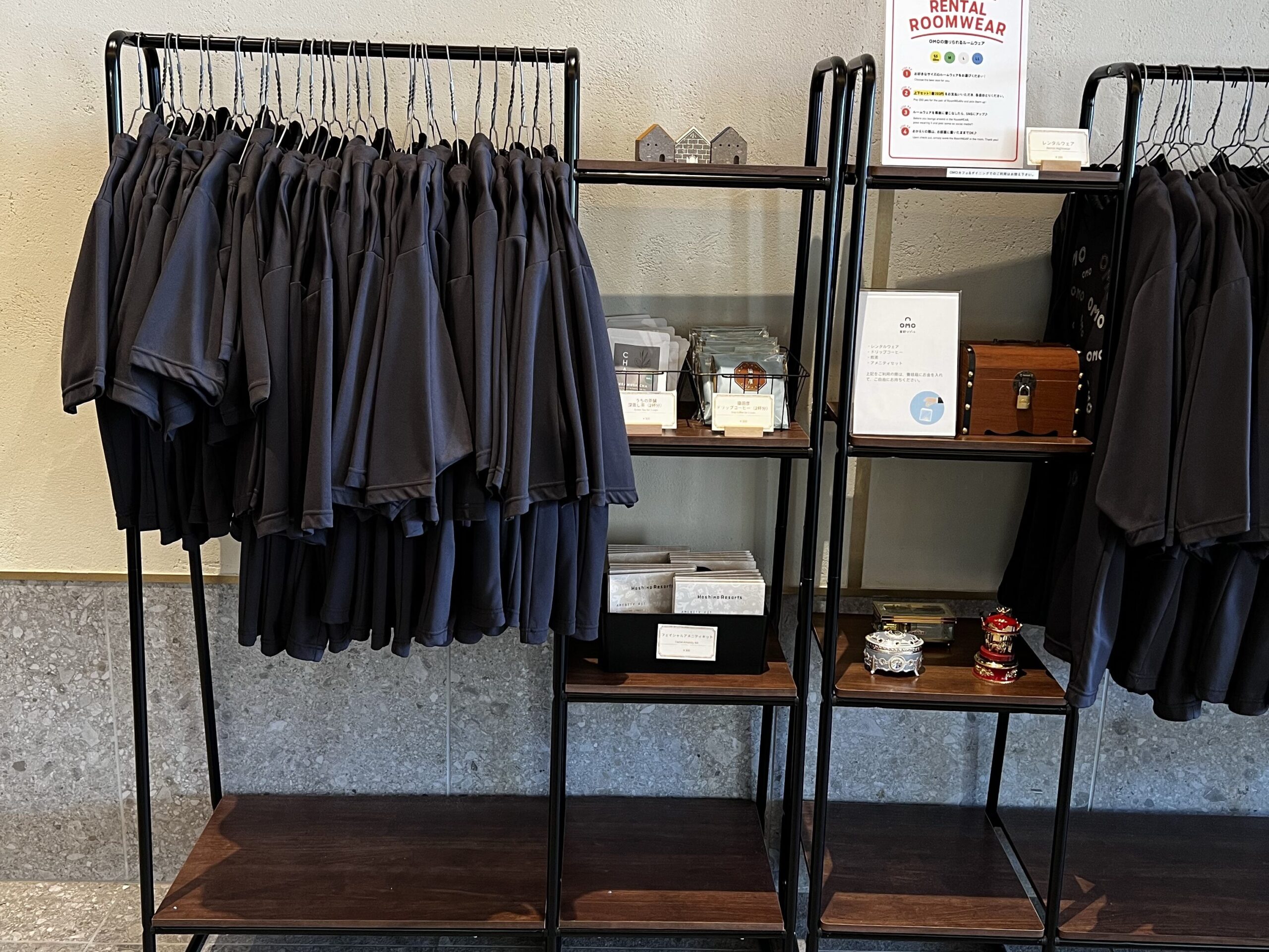 アメニティなどはカウンター横にあり、ルームウェアは有料(200円)でレンタル出来ます