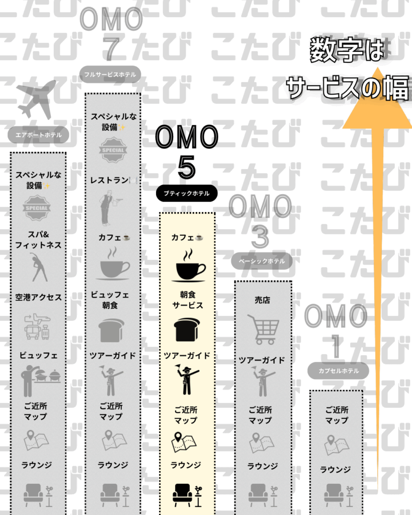 数字はサービスの幅を意味しており、簡単にまとめるとOMO1はカプセルホテル、OMO3は売店もあるホテル、OMO5はカフェもあるホテル、OMO7はフルサービスホテルという風に分けられているようです