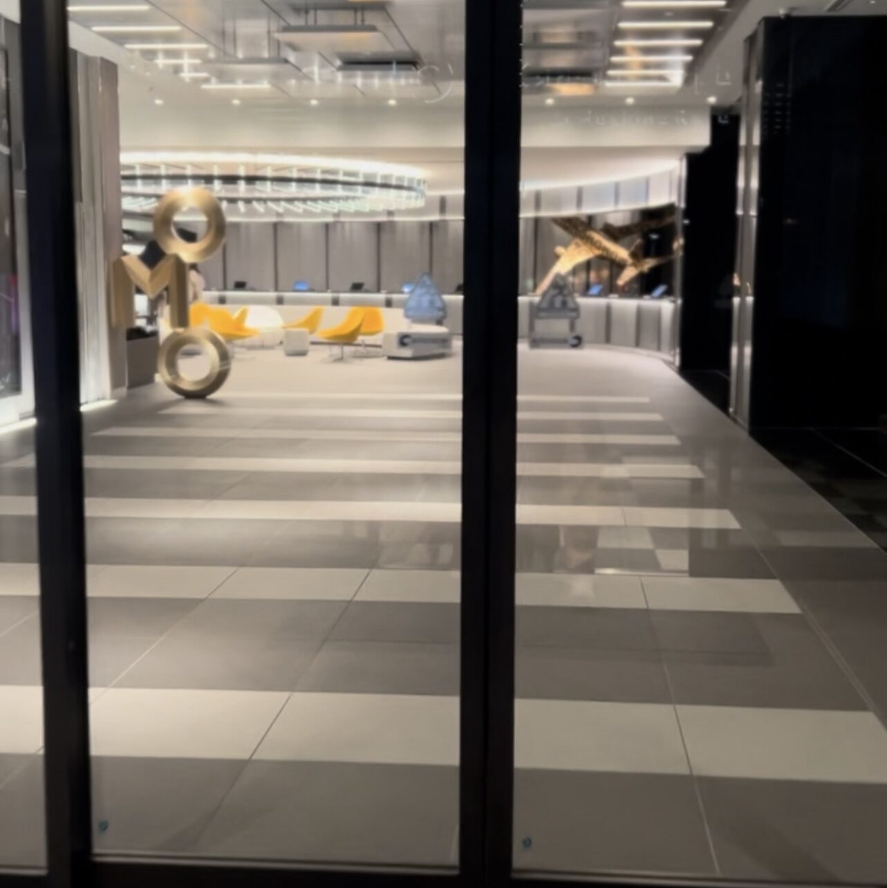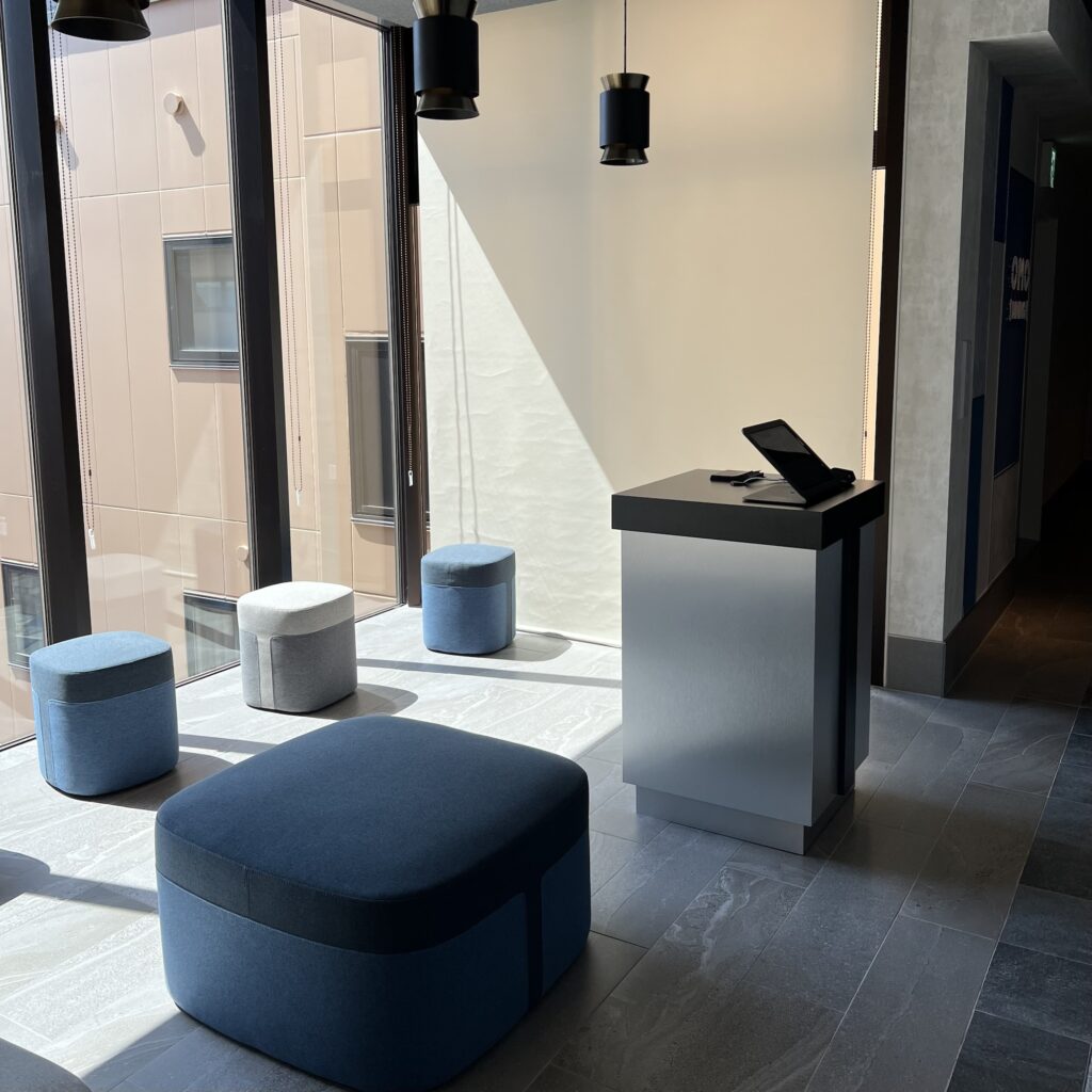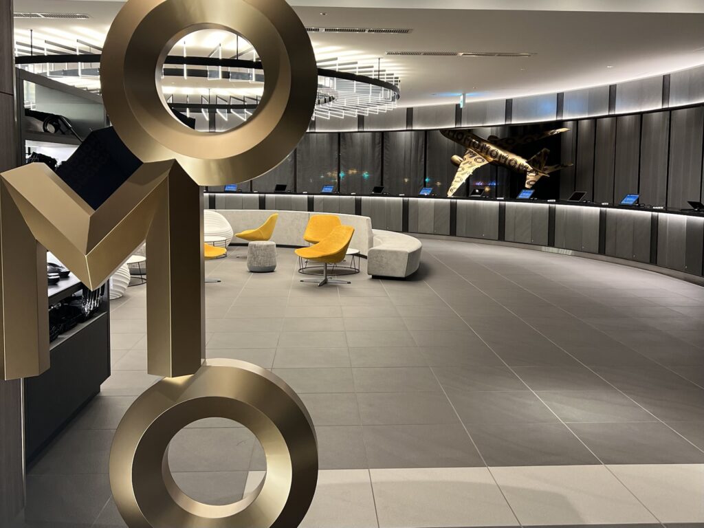 チェックインカウンター前のOMOベースは湾曲を伴ったデザインです
